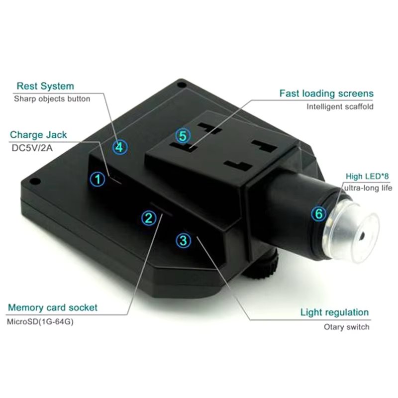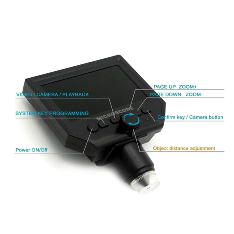 Portable LCD microscope, 4.3 “HD OLED display, magnification 1 – 600x, object distance: 15mm-infinity, with built-in lithium battery, working time: 6 hours. SD card is not included.